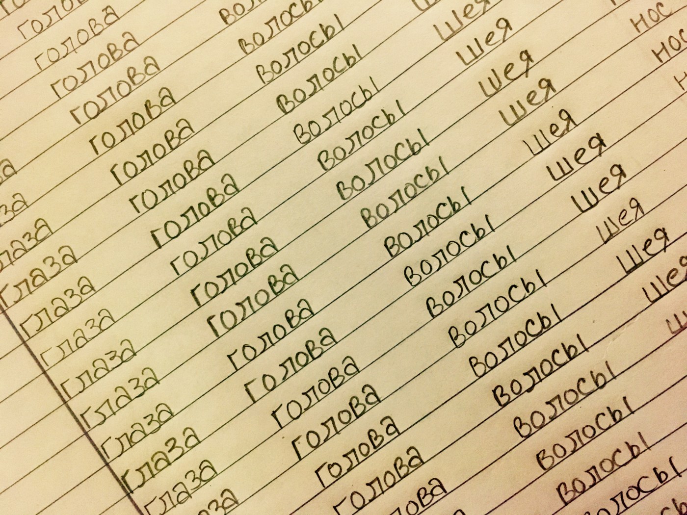 P.S. The featured picture, just like last time, is a click of my practice notebook, where I practiced names of parts of the body. It lists the Russian words for eyes, head, hair, neck and nose. Like I said, one step at a time 🙂